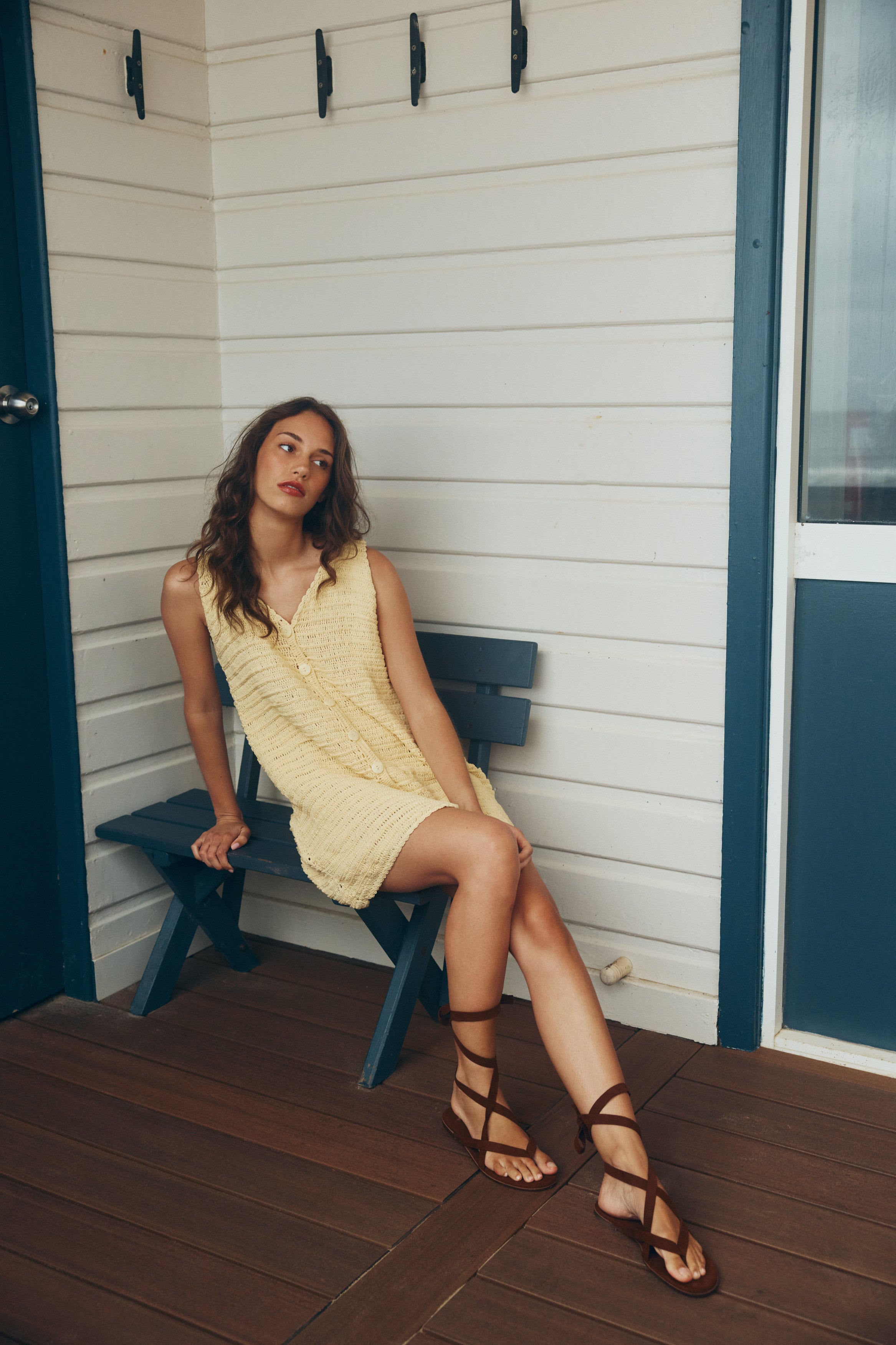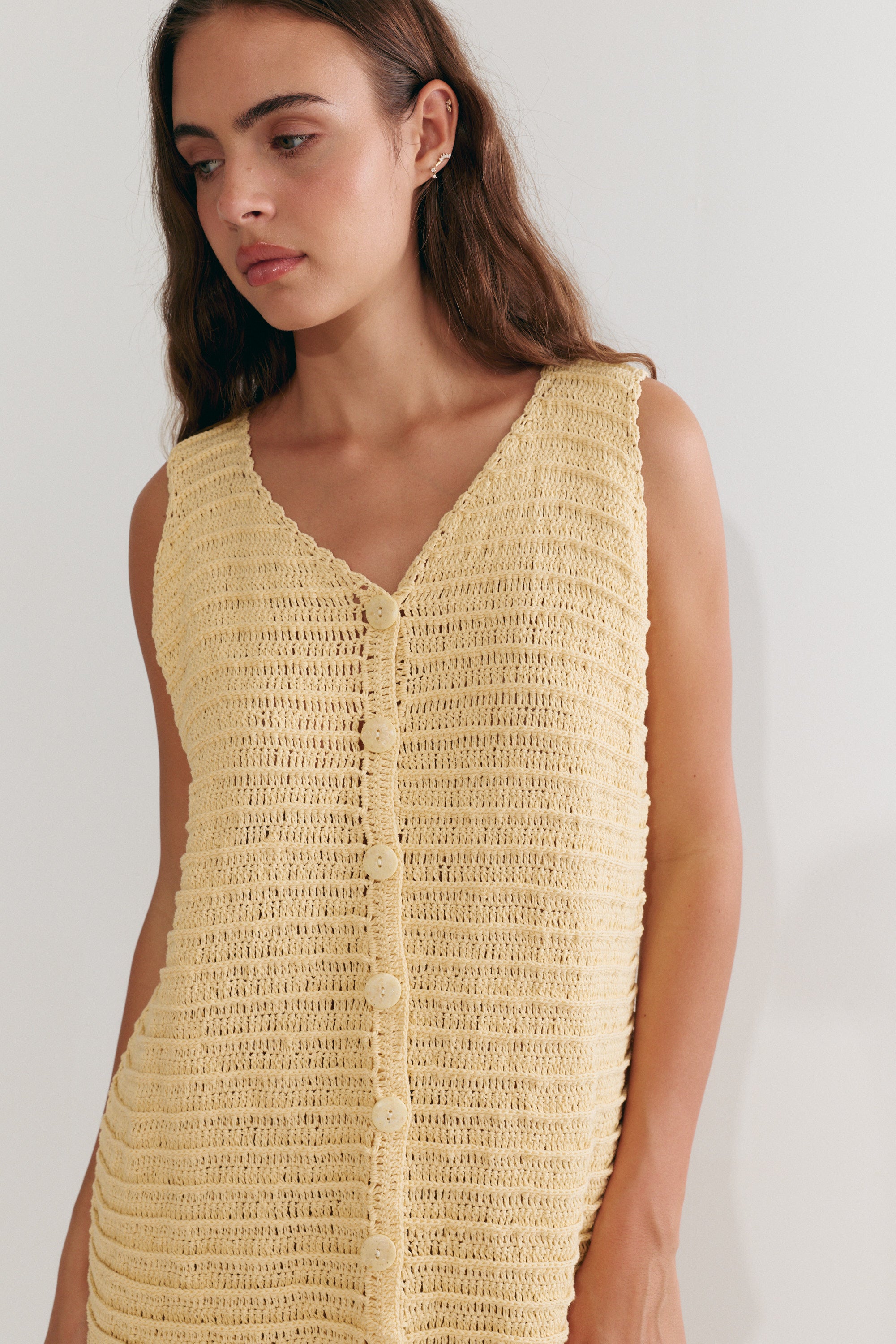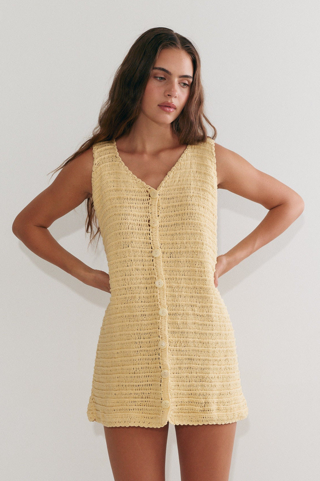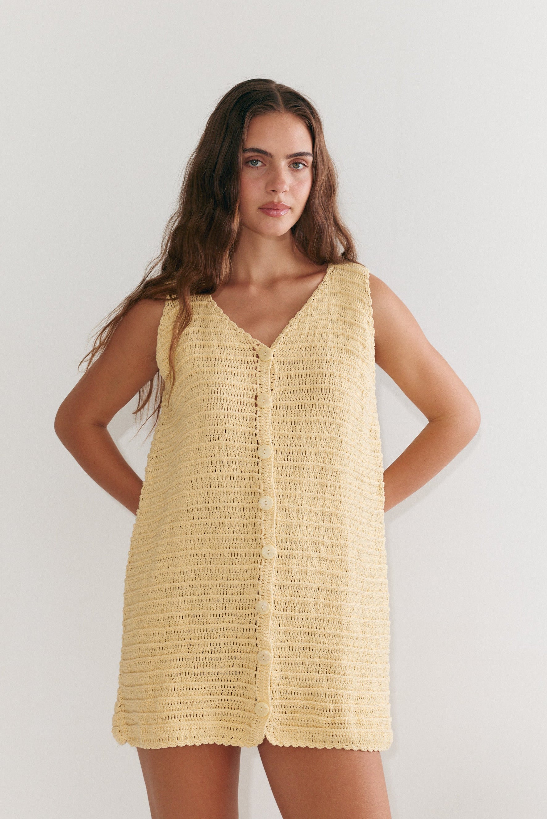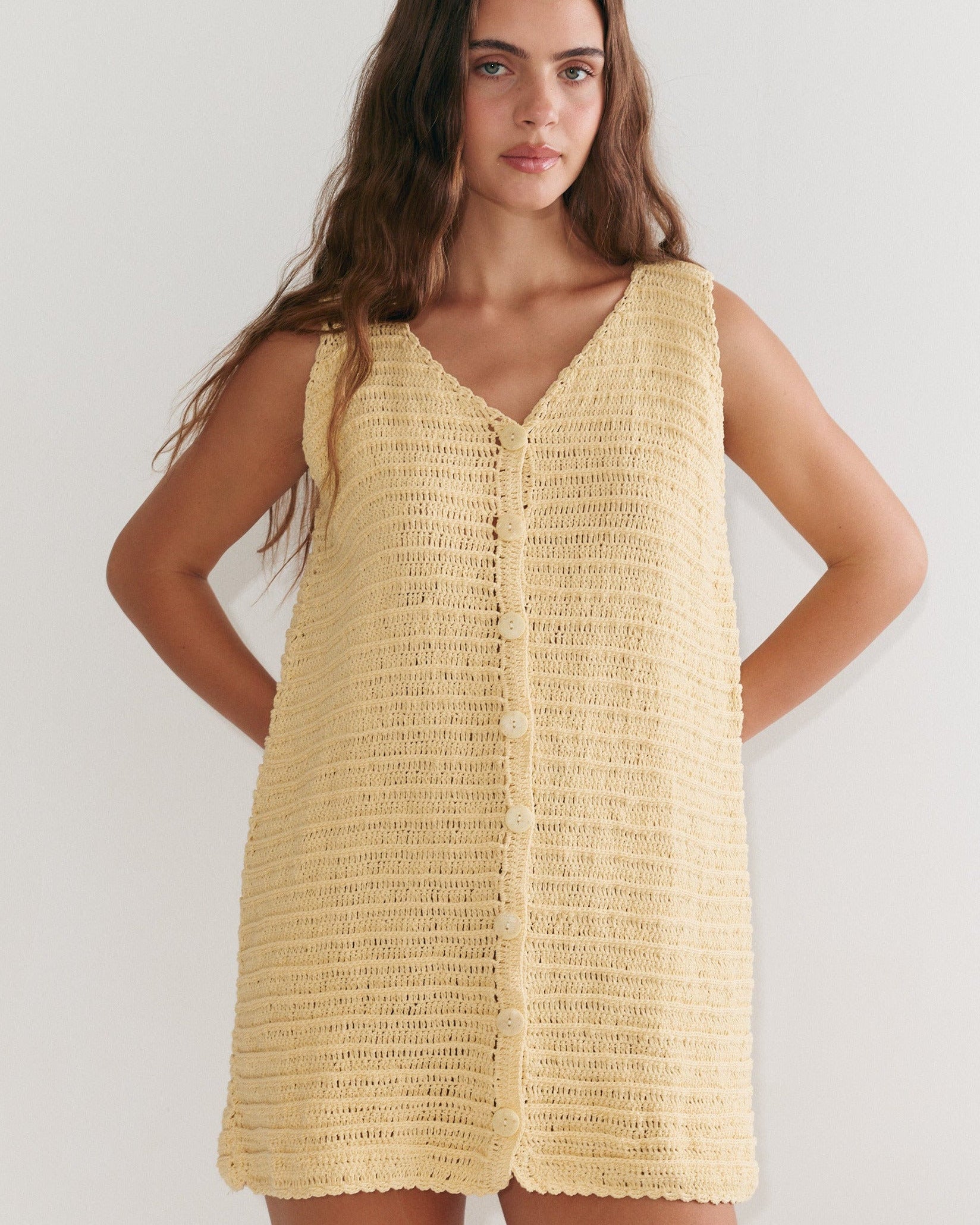 Our crochet shift mini floats lightly over the body, with a boxy, easy fit. Buttons at the front can be left undone to wear it as a vest, creating a layered look. Airy, textured, and effortlessly versatile — a warm-weather staple.