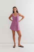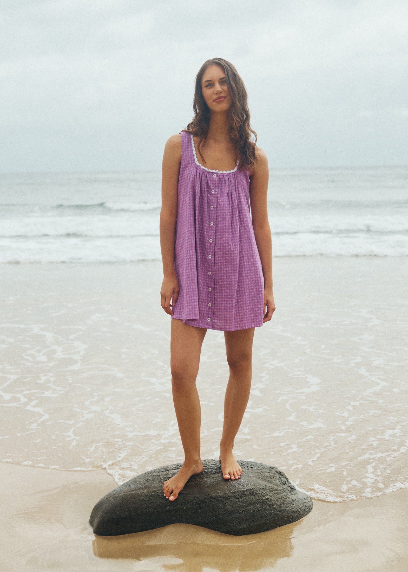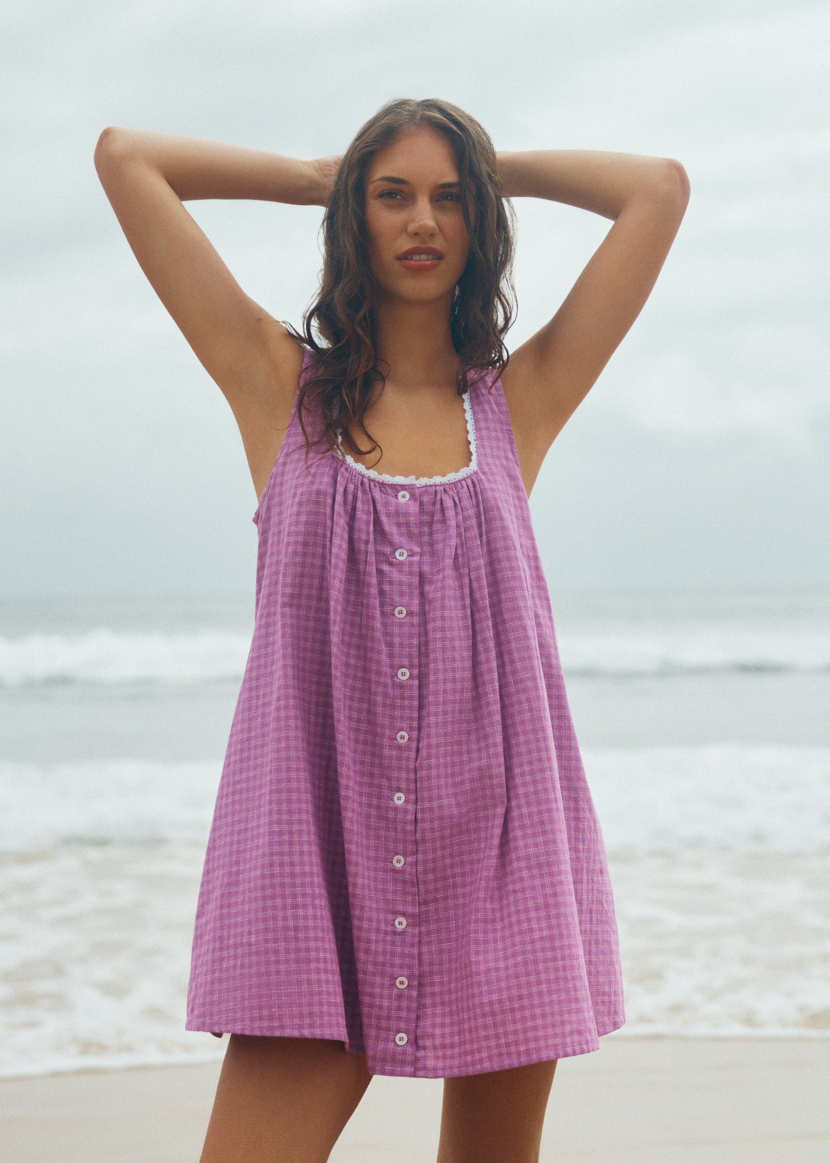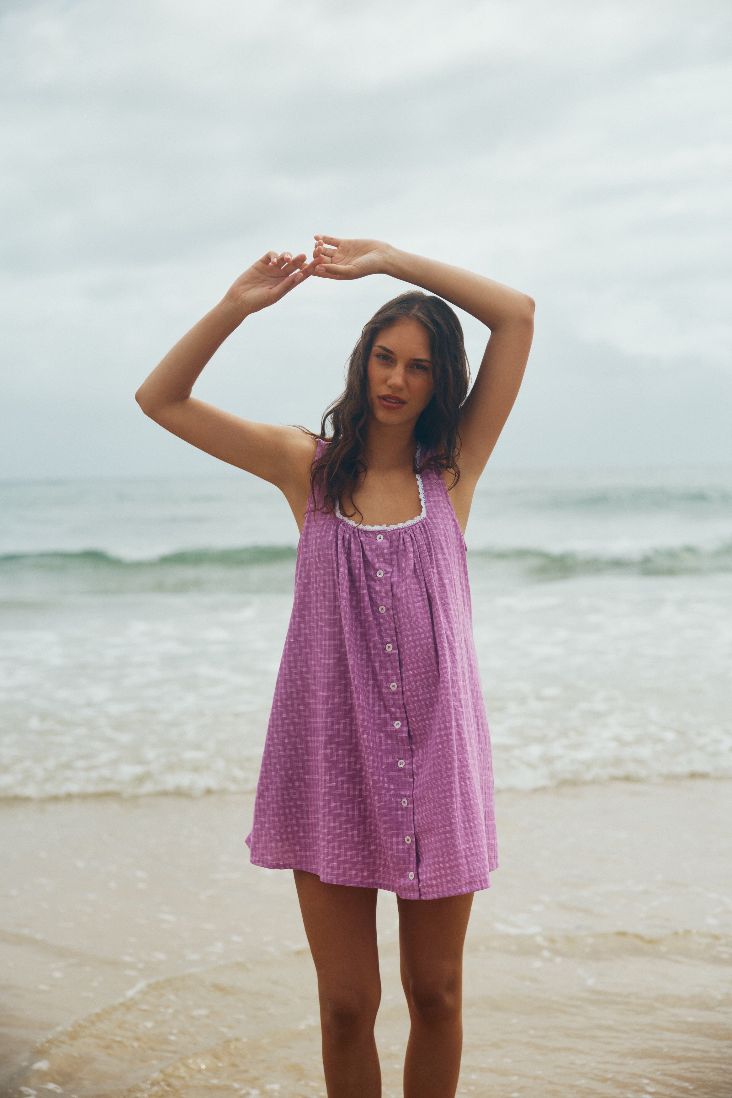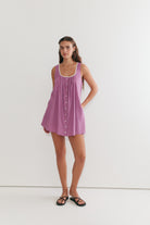 The Pia Mini is a light, feminine mini with soft cotton trims and a button-front. Adjustable ties at the back create a gentle, effortless fit, making it an easy, everyday style that floats off the body.
