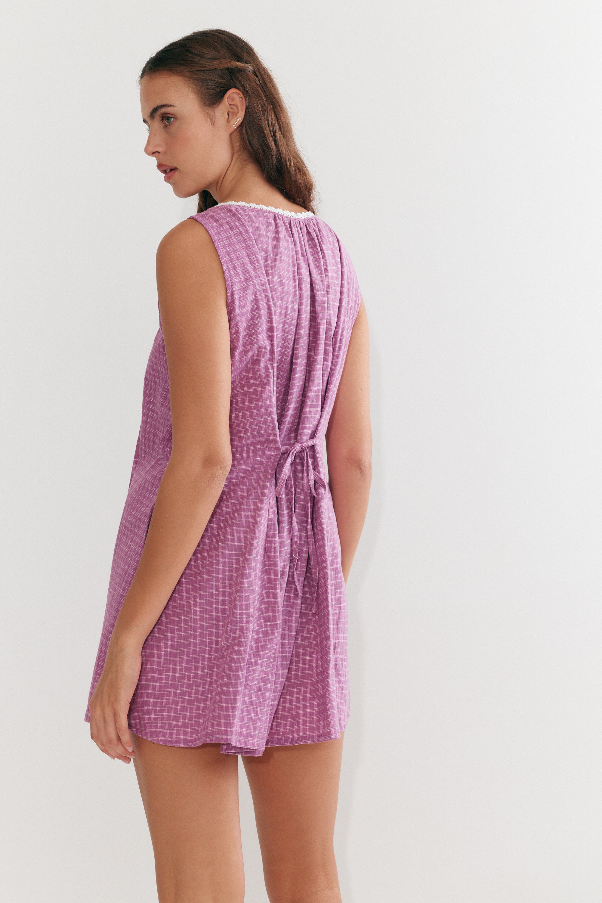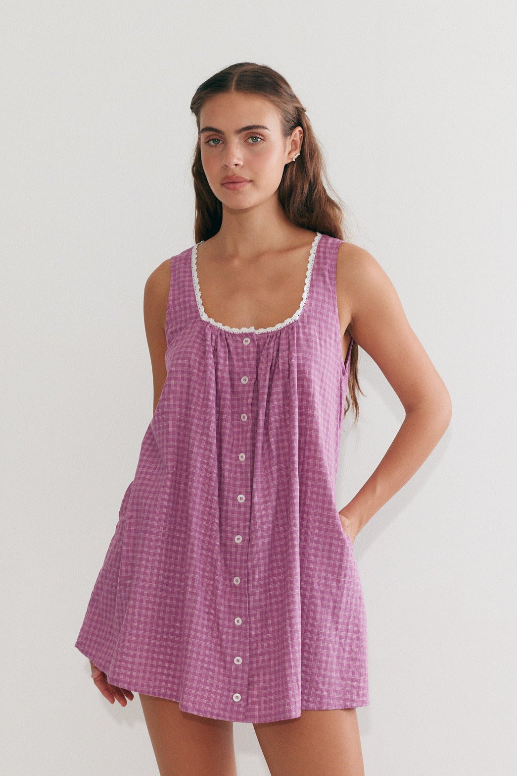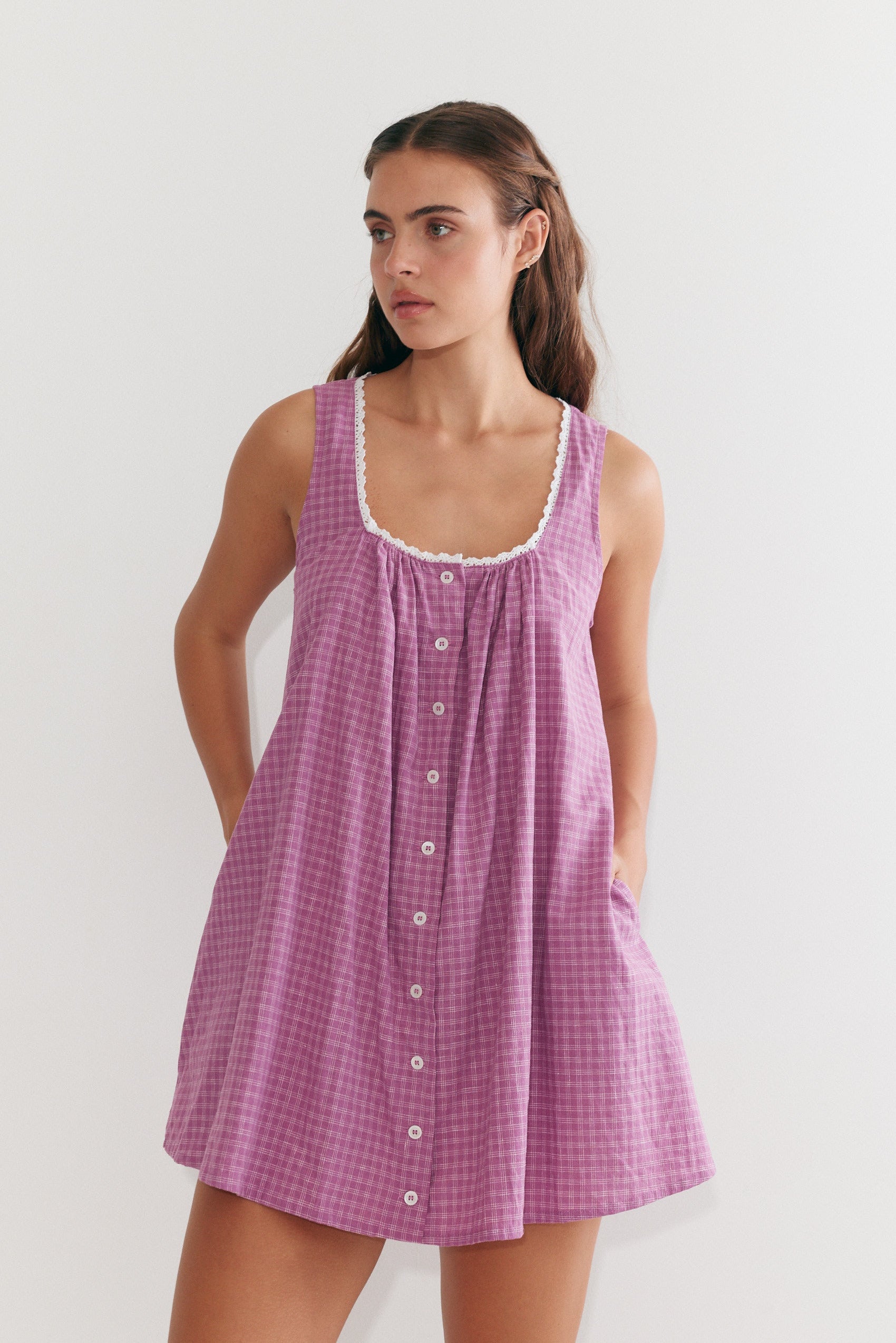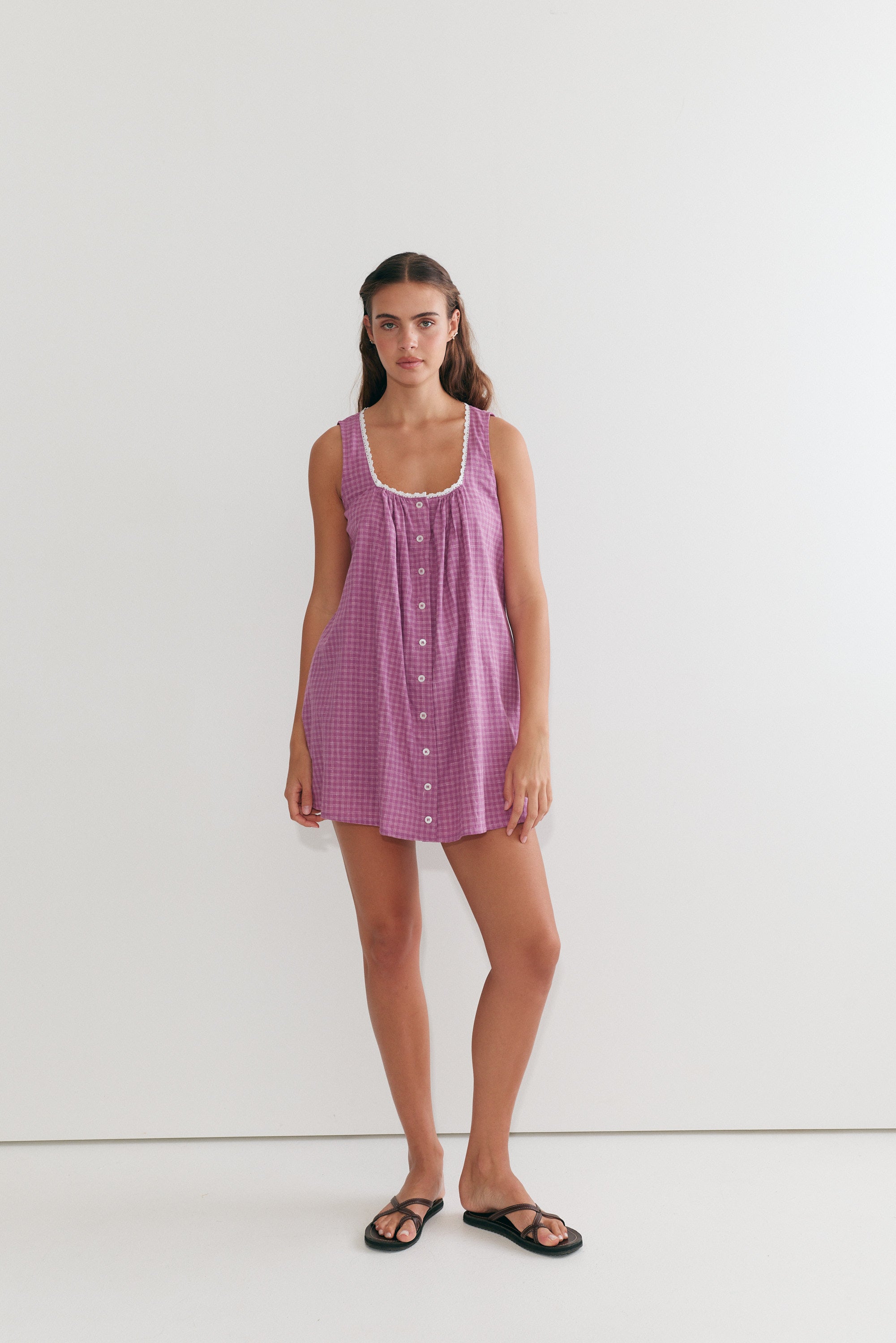 The Pia Mini is a light, feminine mini with soft cotton trims and a button-front. Adjustable ties at the back create a gentle, effortless fit, making it an easy, everyday style that floats off the body.