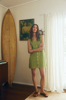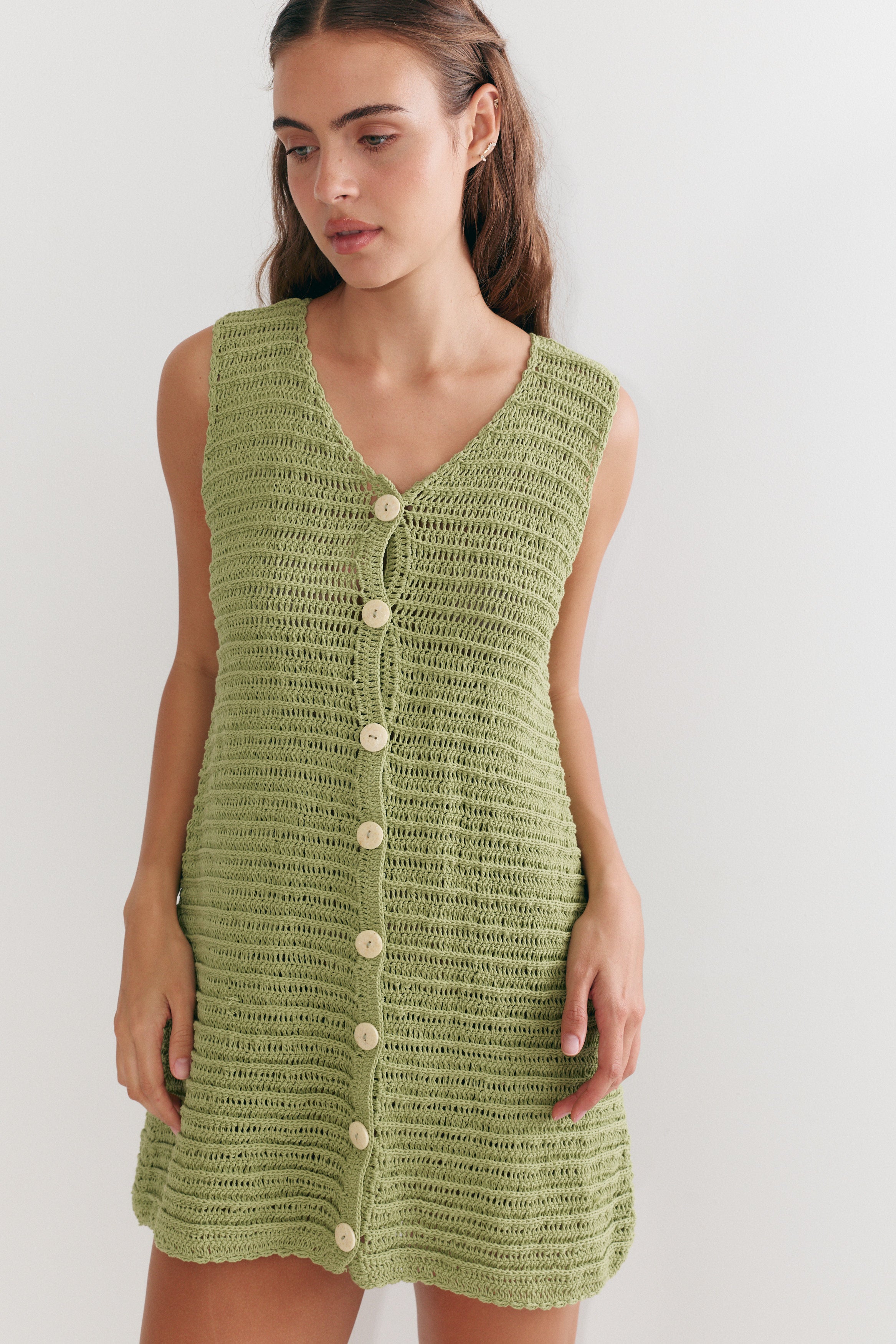 Our crochet shift mini floats lightly over the body, with a boxy, easy fit. Buttons at the front can be left undone to wear it as a vest, creating a layered look. Airy, textured, and effortlessly versatile — a warm-weather staple.