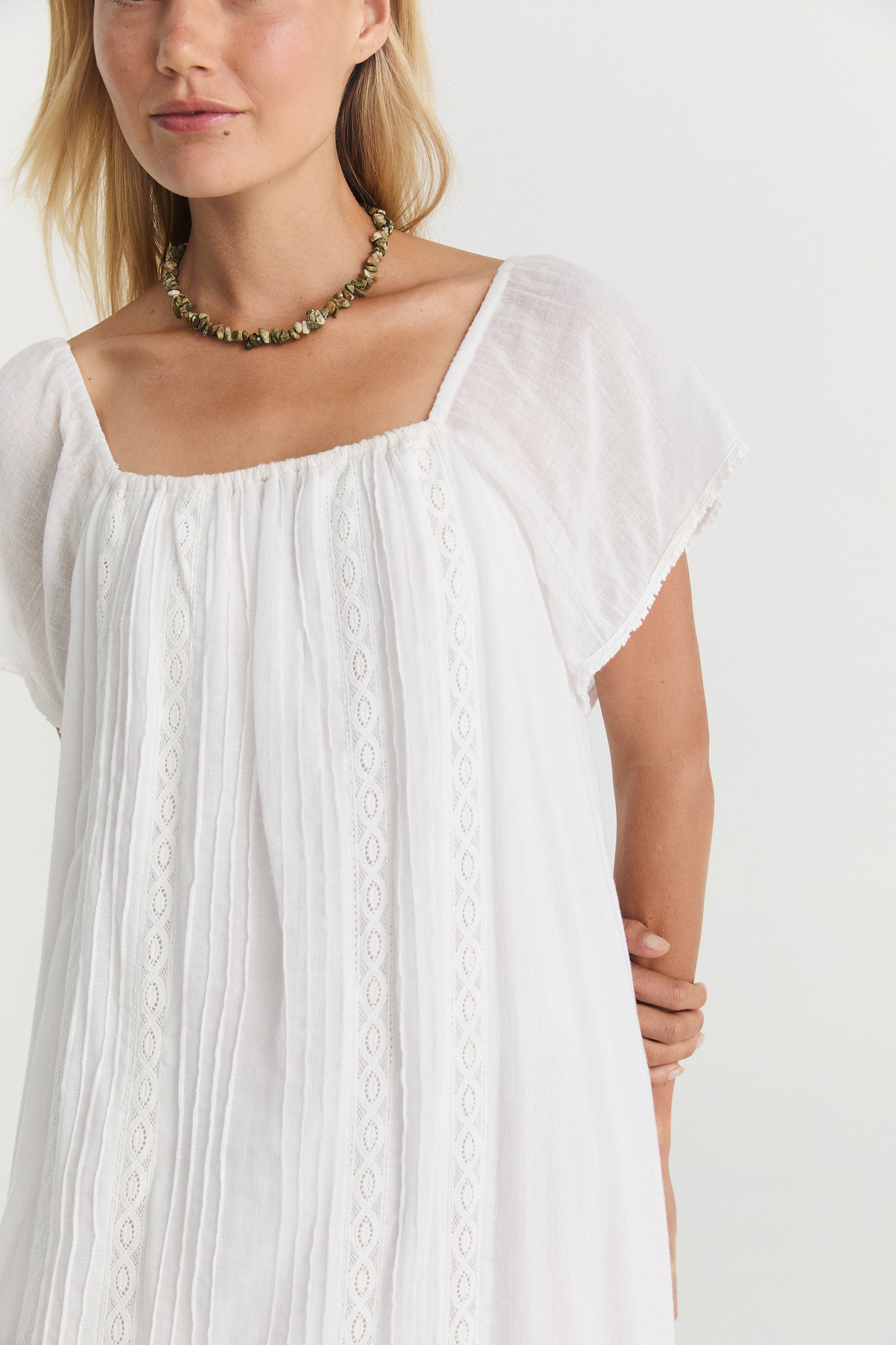 The Noemie Maxi is a romantic yet versatile everyday dress. Featuring delicate pleats, beautiful cotton trims and a removable belt tie allowing you the option to create shape or wear it loosely for a more relaxed, smocked look. The dress can be styled on or off the shoulders, making it a perfect blend of effortless femininity.